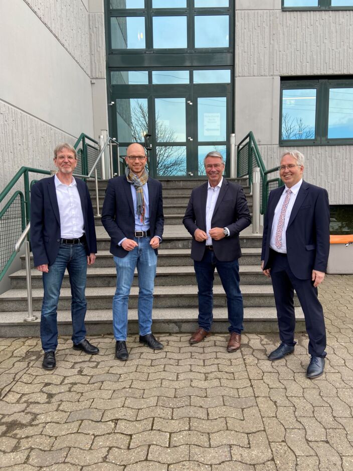 Foto 2: Von links nach rechts: Kreisdezernent Norbert Burmann zusammen mit Landtagskandidat Christian Obrok, dem Landtagsabgeordneten Christian Dahm und Landrat Jürgen Müller vor dem Impfzentrum in Enger.