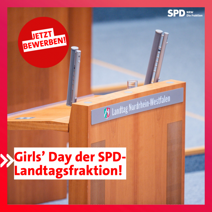 Dann laden wir Euch zum Girls‘ Day der SPD-Fraktion ein. Der Aktionstag für Mädchen und junge Frauen ist am Freitag, 11. Oktober 2024 von 9:00 bis 16:30 Uhr im Landtag Nordrhein-Westfalen in Düsseldorf. (Ihr bekommt natürlich eine Freistellung für den Tag). Der Aktionstag soll Mädchen und junge Frauen in ihrem Engagement stärken, Vernetzungsmöglichkeiten bieten und ihnen Einblicke in die politische Arbeit geben.